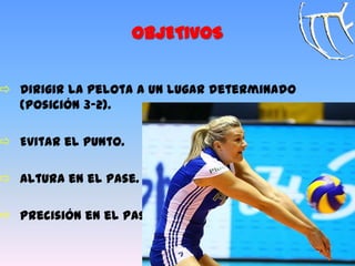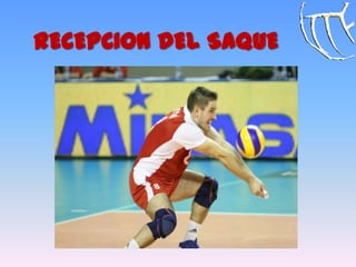 El documento describe los objetivos, principios y componentes de la recepción del saque en voleibol. Explica que la recepción busca dirigir la pelota a una posición determinada con altura y precisión para evitar el punto del rival. Se enfoca en la técnica del golpe de manos bajas y los errores más comunes, además de proponer ejercicios individuales, en parejas y tácticos para entrenar la recepción.