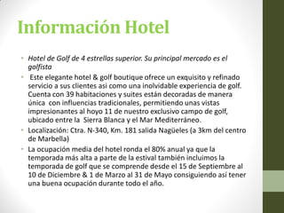 El documento proporciona información sobre el Marbella Golf Resort, un hotel de 4 estrellas superior con 39 habitaciones ubicado cerca de Marbella. El hotel ofrece servicios como un campo de golf de 18 hoyos, restaurante, spa, salón de eventos y piscina. El documento también describe la organización del personal de recepción, incluyendo los turnos, tareas y protocolos de cambio de turno, así como los requisitos para el personal.