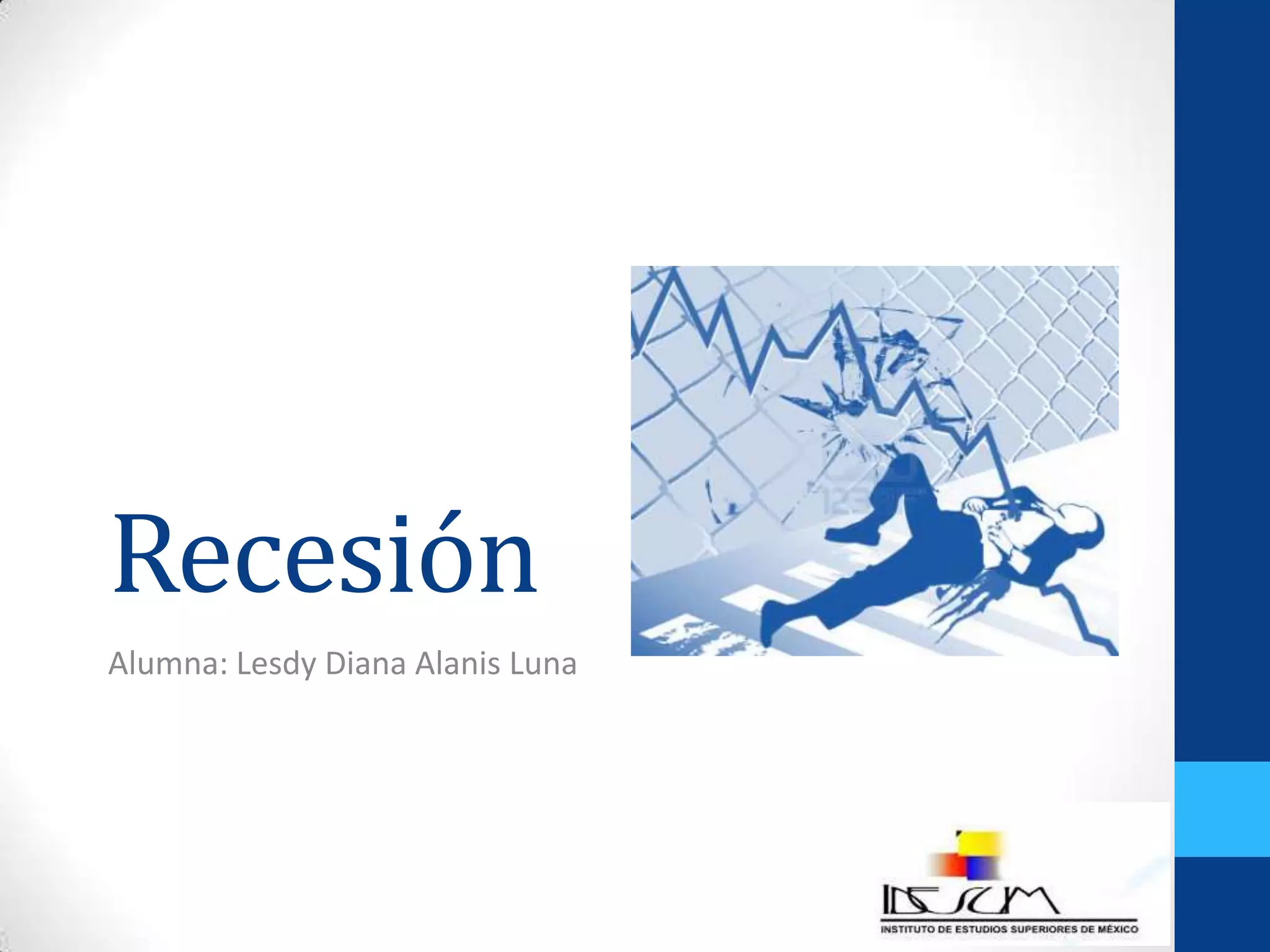 La recesión se define como un periodo superior a 12 meses en el cual el PIB presenta crecimiento negativo, afectando variables como la producción, el consumo y el empleo. Entre sus causas se destacan la sobreproducción, la disminución en el consumo y la corrupción gubernamental. Los síntomas incluyen aumento del desempleo, reducción del consumo y un incremento en créditos impagados.