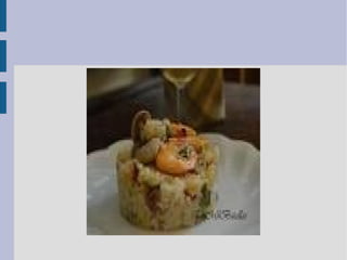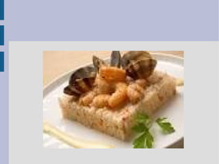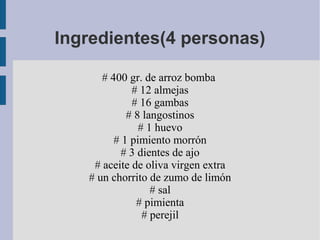 Este documento contiene una receta de arroz marino que incluye ingredientes como arroz bomba, almejas, gambas, langostinos, ajo, pimiento morrón y caldo de pescado. La elaboración implica cocinar el arroz en el caldo de pescado y saltear las gambas y langostinos junto con las almejas, y luego servirlos sobre el arroz acompañado de mahonesa de ajo.