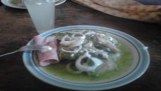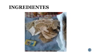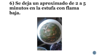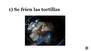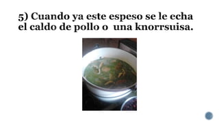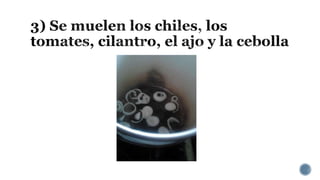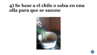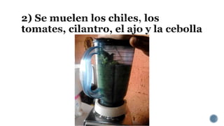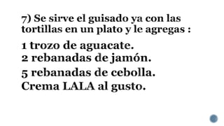 Este documento proporciona una receta para preparar 6 porciones de salsa verde. La receta incluye ingredientes como tomate, chiles, ajo, cilantro y cebolla que se muelen y fríen para hacer la salsa. Luego se agrega caldo de pollo o chorizo y se deja cocinar a fuego bajo por 2-5 minutos. Finalmente, la salsa se sirve con tortillas y se acompaña con aguacate, jamón y cebolla.