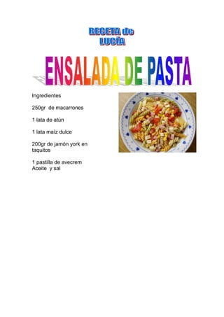 Este plato de macarrones con atún, maíz y jamón york se prepara cociendo primero los macarrones con una pastilla de avecrem, y luego mezclando los macarrones escurridos con atún desmenuzado, maíz en lata y taquitos de jamón york cortados, añadiendo un poco de aceite y sal.