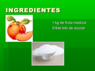 La receta describe cómo hacer mermelada casera con fruta madura y azúcar. Se lava y corta la fruta, se coloca en capas alternas con azúcar en una cazuela de barro y se deja reposar 24 horas. Al día siguiente se machaca la mezcla y se cuece a fuego lento sin parar de remover hasta espesar, luego se enfría y envasa en tarros esterilizados sellados al vacío.
