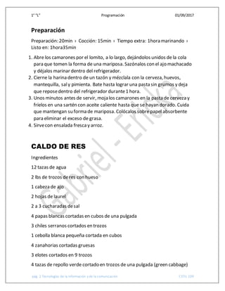 El documento presenta 10 recetas de comida mexicana, incluyendo camarones a la mariposa, pastel de chocolate, caldo de res, salpicón, filete de pescado, hamburguesas, caldo de jaibas, huevo con jamón, caldo de pollo y bistec a la mexicana. Cada receta incluye una lista de ingredientes y los pasos para su preparación.