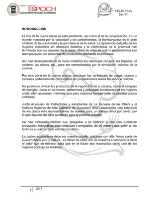El documento discute la pérdida del arte de la buena mesa y la importancia de la gastronomía en la cultura, resaltando la necesidad de rescatar la cocina ecuatoriana. Se presentan recetas representativas que combinan tradición y práctica, con énfasis en la calidad de los ingredientes y el proceso de cocción. Finalmente, se explora la relación entre el arte culinario y la cultura, a través de un extenso glosario de términos y explicaciones sobre técnicas y preparaciones culinarias.