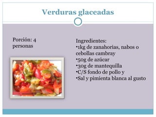 El documento presenta varias recetas culinarias. La primera receta describe cómo glasear verduras como zanahorias y nabos cocinándolos en un caramelo ligero de azúcar, mantequilla y caldo de pollo. La segunda receta es para Gratin Dauphinois, el cual consiste en papas cocidas en leche y crema con queso gruyere. La tercera receta es para papas Dauphine que son bolas de puré de papa rebozadas y fritas.