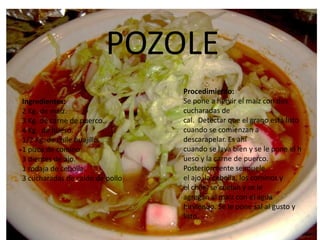 El documento presenta recetas típicas de la cocina mexicana como el pozole, flautas, mole poblano y chalupas. También incluye bebidas como el martini coco, martini de sandía y piña colada, así como postres como el flan napolitano, pastel de tres leches y mousse de chocolate y café.
