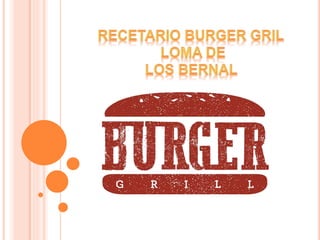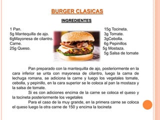 Este documento contiene las recetas e ingredientes para varios tipos de hamburguesas, papas fritas y salsas. Detalla los ingredientes y los pasos para preparar hamburguesas clásicas, argentinas, de pollo y cremosas, así como opciones de papas fritas con chicharrón, tocineta, salchicha y papas fritas artesanales. También incluye recetas para chimichurri, pico de gallo y cebolla caramelizada.