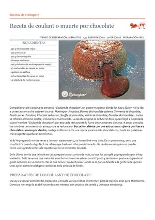 Este documento presenta dos recetas con chocolate. La primera receta es para un postre llamado "Coulant de chocolate", que consiste en un bizcocho caliente con chocolate cremoso en el interior. La segunda receta es para brownies con café y avellanas. El documento proporciona instrucciones detalladas para preparar ambas recetas, incluidos los ingredientes y los pasos a seguir. También incluye comentarios sobre la facilidad y el sabor de los postres.