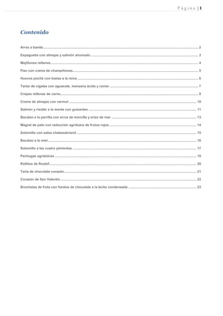 El documento proporciona 18 recetas de cocina que incluyen platos como arroz a banda, espaguetis con almejas y salmón ahumado, mejillones rellenos, flan con crema de champiñones, entre otros. Cada receta incluye los ingredientes necesarios y los pasos a seguir de forma detallada.