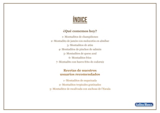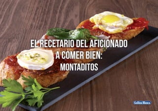 Este documento presenta varias recetas de montaditos, incluyendo montaditos de champiñones, jamón con melocotón, atún, salmón, queso azul y otros. Proporciona instrucciones detalladas para preparar cada montadito de manera fácil y rápida. También incluye recetas recomendadas de montaditos de esqueixada, tropicales gratinados y escalivada con anchoas. El objetivo es ofrecer una variedad de opciones deliciosas y versátiles para comer como montaditos.