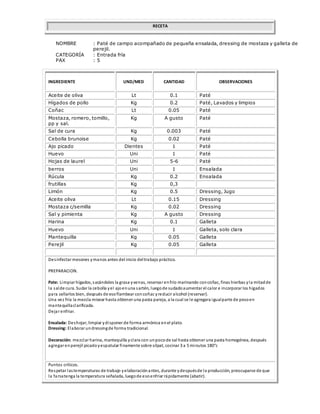 Este documento contiene 3 recetas para preparar diferentes platos para un menú de 5 personas. La primera receta es un paté de campo acompañado de ensalada y galletas de perejil. La segunda receta es un ballotin de pollo relleno de pistachos con ensalada y papel de tomate. La tercera receta es tournedos a la plancha con salsa diabla, papas dauphinoise, zanahorias glaseadas y espinacas craqueladas. Cada receta incluye los ingredientes y los pasos de preparación.