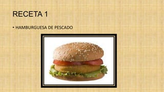 El documento presenta 6 recetas de pescado y mariscos que incluyen ingredientes como filete de pescado, atún, langosta, calamares, queso y verduras. Las recetas son hamburguesa de pescado, pizza de pescado, brochetas de pescado, tortilla de atún, lenguado con patatas y canelones de atún.