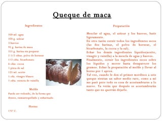 El documento proporciona dos recetas que incluyen maca: 1) Un queque de maca con harina de maca, harina sin preparar, azúcar, huevos, aceite, vinagre y otros ingredientes. 2) Un jugo de maca hecho con maca seca cocinada, claras de huevo y miel, que provee un líquido marrón dulce natural de la maca.