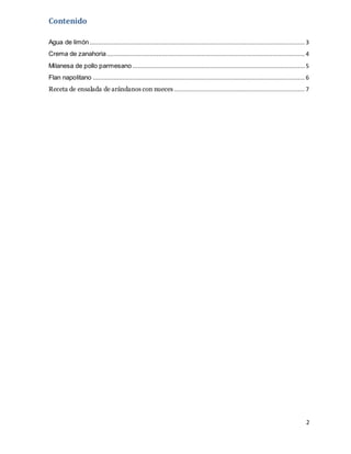 El documento presenta 5 recetas: agua de limón, crema de zanahoria, milanesa de pollo parmesano, flan napolitano y ensalada de arándanos con nueces. Cada receta incluye una lista de ingredientes y pasos detallados para su preparación. El documento provee instrucciones completas para cocinar diferentes platillos dulces y salados.