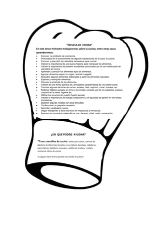 Este documento describe un proyecto escolar sobre cocina. Los estudiantes aprenderán sobre la profesión de cocinero, utensilios de cocina, higiene alimentaria, tipos de alimentos, técnicas básicas de cocina y elaborarán recetas sencillas. Realizarán actividades como ver una película, confeccionar delantales, decorar el aula, elaborar la pirámide alimenticia y organizar una competición culinaria.