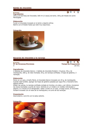 Este documento contiene varias recetas de postres y dulces a base de chocolate. La primera receta es para un arroz con chocolate. Otras recetas incluyen un ballet de chocolate y frambuesa, un batido de chocolate merengado de origen español, y un bavarois de chocolate a la naranja. El documento también incluye instrucciones detalladas para hacer un bizcocho coulant de chocolate al estilo francés.