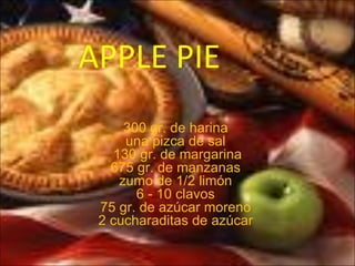 El documento proporciona instrucciones para preparar tres recetas: una tarta de manzana, un pastel de carne y papas (Shepard's Pie) y un plum cake. Para la tarta de manzana, se estiran dos mitades de masa para cubrir un molde y rellenarlo con lonchas de manzana, clavos y azúcar moreno. El Shepard's Pie consiste en carne picada y huevos duros cubiertos con puré de papas y queso. El plum cake incluye mantequilla, azúcar, fruta confit