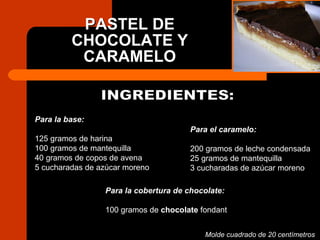 El documento presenta dos recetas dulces con chocolate. La primera es un pastel de chocolate y caramelo hecho con una base de harina, mantequilla y avena, y relleno de caramelo y cobertura de chocolate. La segunda receta es para brownies con almendras, elaborados con chocolate, manteca, azúcar, huevos, harina y almendras.