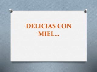 Este documento presenta varias recetas dulces que incluyen miel como ingrediente principal. La primera receta es para una torta de la abuela hecha con harina, azúcar, huevos, aceite y miel. Luego siguen recetas para masitas de miel, barritas de cereal con miel y copos de maíz, y por último un budín de miel con leche, huevos y harina. Todas las recetas brindan instrucciones detalladas sobre los ingredientes y pasos para preparar cada delicia.