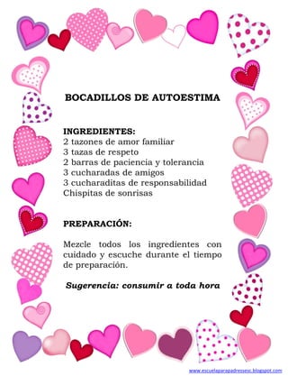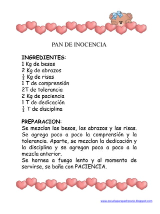 El pan de inocencia se prepara mezclando besos, abrazos y risas, y agregando poco a poco comprensión, tolerancia, dedicación y disciplina. Se hornea a fuego lento y se sirve bañado en paciencia. Los bocadillos de autoestima se preparan mezclando amor familiar, respeto, paciencia, tolerancia, amigos y responsabilidad, y espolvoreando sonrisas. Se mezclan todos los ingredientes con cuidado escuchando durante la preparación, y se sugiere consumirlos a toda hora.