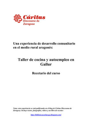 Este documento presenta varias recetas tradicionales aragonesas que fueron enseñadas en un taller de cocina y autoempleo en la localidad rural de Gallur. Incluye recetas para pan de horno, croquets de almendra, magdalenas, bagrir y otros platos típicos de la gastronomía aragonesa. El documento proporciona una lista detallada de ingredientes y pasos para preparar cada receta.