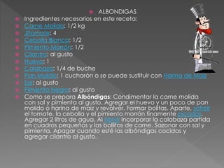 Este documento contiene recetas de varios platillos y caldos mexicanos tradicionales. Incluye ingredientes y pasos para preparar albóndigas, caldo mexicano, bollitos, caldo tlalpeño, cochinita pibil, pollo en mole, mole de olla, enchiladas suizas, chocoflan y otros. Las recetas varían en complejidad pero todas comparten ingredientes típicos de la cocina mexicana como chiles, frijoles, maíz y especias.