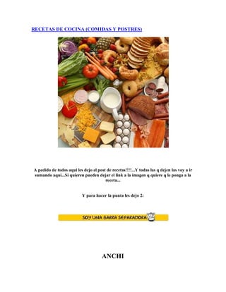 Este documento contiene varias recetas de cocina tradicionales de diferentes países de América Latina, incluyendo recetas para comidas como anchi, locro salteño, gringas y baleadas, así como postres como alfajor santafesino, arroz con leche y galletas de la casa Neiman-Marcus. El documento fue compartido para intercambiar recetas entre los miembros del grupo.