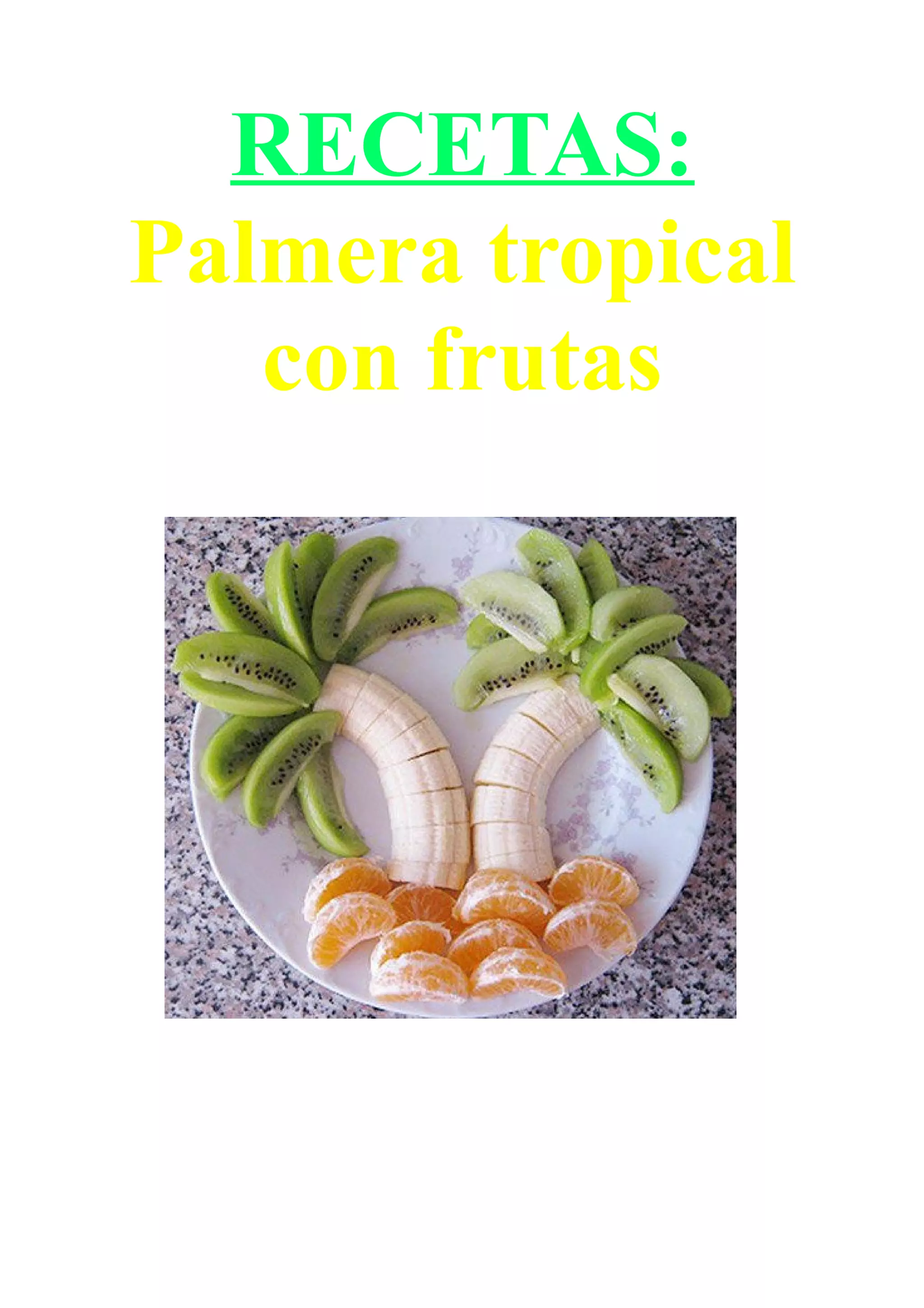 El documento presenta recetas para tres platos de frutas y verduras: 1) una palmera tropical hecha con mandarinas, plátano y kiwis; 2) una pizza de frutas hecha con galletas, mantequilla, mermelada y frutas como kiwi y fresa; 3) setas de patata, tomate y guisantes simuladas con patatas, tomates y guisantes.