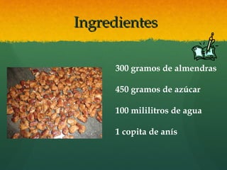 Este documento proporciona instrucciones en 11 pasos para hacer almendras garrapiñadas. Se comienza calentando azúcar, agua y anís hasta que el azúcar se caramelice, luego se agregan las almendras y se sigue cocinando y removiendo hasta que el azúcar se solidifique completamente alrededor de las almendras. Finalmente, las almendras garrapiñadas se separan y se enfrían antes de servirse.