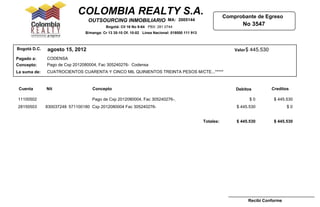 COLOMBIA REALTY S.A. Comprobante de Egreso