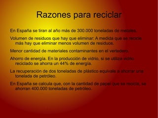 El documento habla sobre las razones para reciclar y los materiales que se pueden reciclar. Algunas de las principales razones para reciclar son reducir el volumen de residuos en vertederos, ahorrar energía en la producción de nuevos materiales y ahorrar petróleo. Los materiales que se pueden reciclar incluyen papel, plástico, vidrio, metales y pilas.