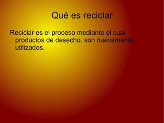 Este documento describe el proceso de reciclaje y las razones para reciclar. Algunos de los materiales que se pueden reciclar son el papel, el vidrio, el plástico, el metal y las pilas. Reciclar ayuda a reducir la contaminación, ahorrar energía y recursos naturales.