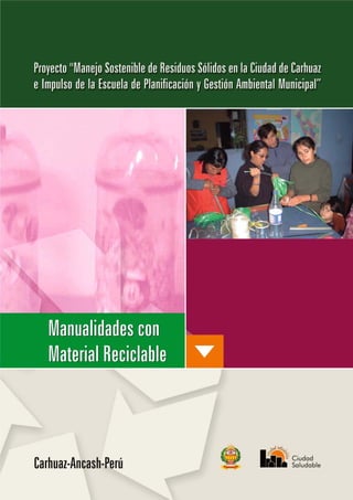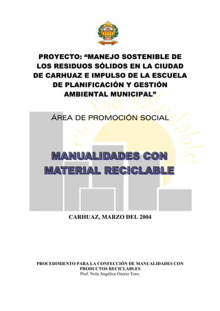 Este documento presenta 13 procedimientos para hacer manualidades con materiales reciclables como botellas y bolsas plásticas. Algunas de las manualidades descritas incluyen un piso de arco iris hecho con bolsas plásticas, un oso portalápices hecho con una botella de aceite vacía, y estrellas de Belén hechas con botellas plásticas. El objetivo es promover el reciclaje y reutilización de materiales entre niños, jóvenes y familias.