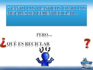 Este documento trata sobre los diferentes tipos de materiales como plásticos, metales y sus propiedades. Explica que los plásticos y metales son ampliamente utilizados en productos industriales y que los metales conducen electricidad y calor. Además, detalla los beneficios del reciclaje como prevenir el desperdicio de recursos, reducir la contaminación y las emisiones de gases de efecto invernadero. Finalmente, proporciona ejemplos de cómo se pueden reciclar diferentes materiales como papel, vidrio, chatarra