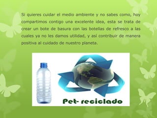 Este documento describe cómo hacer un bote de basura reciclado con botellas de PET. Explica que las botellas de plástico no se degradan fácilmente y es importante reciclarlas. Luego detalla los materiales necesarios como alambre, ganchos de ropa y botellas PET y las instrucciones para ensamblarlo, las cuales incluyen hacer orificios en las tapas y fondos de las botellas con un picahielos calentado y ensartarlas en alambres para formar las paredes del bote. El objetivo es reco
