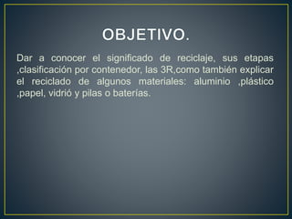 El documento habla sobre el significado y etapas del reciclaje, la clasificación por contenedores y las 3R. Explica el reciclaje de materiales como aluminio, plástico, papel, vidrio y pilas. Describe los procesos de reciclaje de estos materiales, sus beneficios y la importancia de reciclar pilas para proteger el medio ambiente.