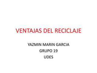 El documento describe las ventajas y la importancia del reciclaje. El reciclaje permite conservar recursos naturales y energía, reducir los residuos y proteger el medio ambiente. Algunos materiales como aceites y pinturas no son reciclables. El reciclaje beneficia la economía al reducir el consumo de materias primas y energía costosas. Sin embargo, la falta de educación en la sociedad dificulta el reciclaje debido a la resistencia al cambio de hábitos.
