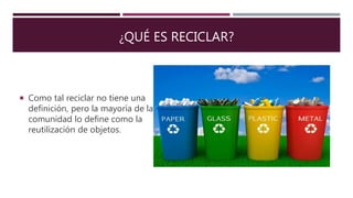 El documento define el reciclaje como la reutilización de objetos. Explica que el reciclaje se divide en reducir, reutilizar y reciclar. Luego detalla los diferentes contenedores de color usados para reciclar diferentes materiales como papel, vidrio, plástico, restos orgánicos y desechos peligrosos. Finalmente incluye fuentes sobre el tema del reciclaje.