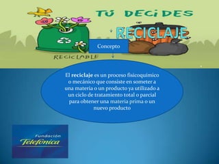 El documento resume el proceso de reciclaje, incluyendo sus objetivos de conservación de recursos y protección ambiental. Explica las etapas del reciclaje como la recolección, clasificación y procesamiento de materiales. También describe las tres erres de reducir, reutilizar y reciclar para el manejo de desechos, y los beneficios del reciclaje como ahorro de recursos y reducción de contaminación.