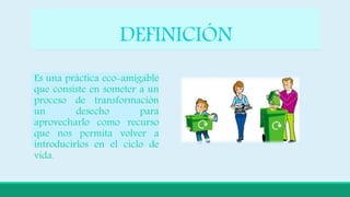 El reciclaje es una práctica ecológica que consiste en transformar desechos como plástico, papel, cartón, vidrio y latas para reintroducirlos en el ciclo de vida. Al reciclar, ahorramos energía, usamos menos recursos naturales, creamos empleos y preservamos el medio ambiente. Las 4R - reducir, reutilizar, recuperar y reciclar - son los principios fundamentales de la educación ambiental para generar menos desechos.