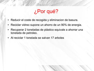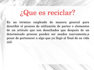 Reciclar es el proceso de reutilizar partes o elementos de un artículo desechado después de un proceso de tratamiento para que puedan usarse nuevamente. Reciclar ayuda a reducir los costos de recolección y eliminación de basura, ahorrar energía y petróleo, y salvar árboles. El documento también describe los diferentes contenedores para reciclar vidrio, papel, cartón, envases y más.