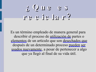 El documento explica brevemente qué es el reciclaje y por qué es importante. El reciclaje implica reutilizar partes o elementos de un artículo desechado en un nuevo producto tras un proceso de tratamiento. Reciclar reduce los costes de gestión de residuos y ahorra recursos naturales como el petróleo y los árboles. Para reciclar correctamente, los ciudadanos deben separar los residuos en los contenedores adecuados según su tipo: amarillo para envases, azul para papel y cartón, y verde para vid