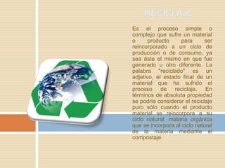El documento describe el proceso de reciclaje, sus beneficios y obstáculos. El reciclaje permite ahorrar recursos naturales, energía y agua, mientras reduce la contaminación y cantidad de basura. Aunque el reciclaje enfrenta obstáculos como la falta de educación pública, nuevas tecnologías pueden superar estos desafíos y promover una cultura del reciclaje.