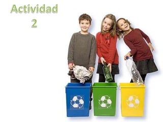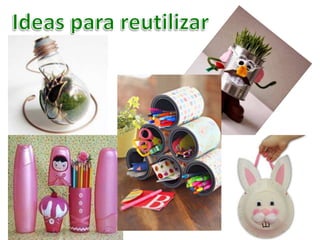 El documento busca concientizar a los alumnos sobre la importancia de cuidar el medio ambiente a través del uso de las tres erres: reducir, reciclar y reutilizar. Propone diferentes actividades como relacionar imágenes contaminantes con opciones más ecológicas, explicar el concepto de reciclaje y cómo clasificar los residuos, y mostrar técnicas para reutilizar materiales reciclados.
