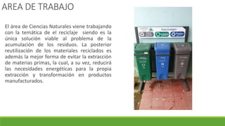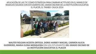 El documento describe un proyecto en la institución educativa El Placer, El Tambo-Cauca, que busca cambiar actitudes de los estudiantes de grado décimo hacia el manejo de residuos sólidos mediante el uso de tecnologías de la información y la comunicación (TIC). A través de charlas de sensibilización y talleres prácticos, se identificaron y abordaron los malos hábitos de los estudiantes en relación al reciclaje, fomentando un ambiente escolar más limpio y organizado. Se espera que el proyecto genere un cambio significativo en la conciencia ambiental de los estudiantes y promueva el uso de herramientas TIC en la conservación del medio ambiente.
