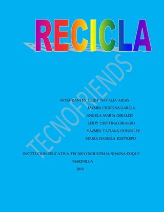 Este documento presenta información sobre el reciclaje de diferentes materiales como papel, vidrio, aluminio y plástico. Explica los procesos de reciclaje, sus beneficios ambientales como la reducción de residuos, preservación de recursos y reducción de costos de producción. También define conceptos clave como las 3R's, la cadena de reciclaje y destaca la importancia de separar correctamente los materiales reciclables.