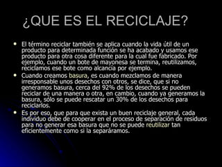 El documento habla sobre el reciclaje, explicando que es el proceso de reutilizar materiales que de otra forma se convertirían en desechos. Menciona que el reciclaje reduce el impacto ambiental al disminuir la necesidad de recursos naturales, la contaminación de vertederos y las emisiones de gases de efecto invernadero. También describe los pasos básicos del reciclaje de vidrio, papel y plástico.