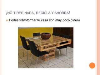 La guía ofrece consejos para reciclar pallets de madera en la casa y el jardín para renovarlos gastando poco dinero, además de resaltar la importancia del reciclaje para ahorrar recursos y no desechar materiales innecesariamente.