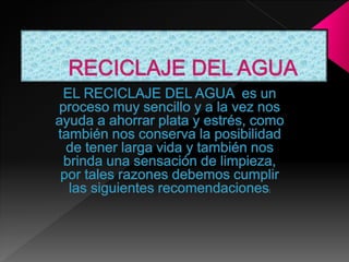 El documento habla sobre la importancia del reciclaje del agua. Recomienda recolectar el agua usada al bañarse, lavarse los dientes o lavar la ropa para reutilizarla en otras tareas de limpieza y así ahorrar agua. También menciona la importancia de revisar las tuberías y llaves para prevenir fugas.